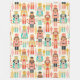 A seamless pattern featuring an array of classic nutcracker soldiers in colourful vintage-inspired attire, surrounded by festive Christmas ornaments in shades of red, teal, pink, and gold. The design evokes a nostalgic holiday atmosphere with its playful arrangement and traditional characters, capturing the magic and warmth of the season.