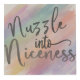 design features the text "Nuzzle into Niceness" in a playful, handwritten font, surrounded by colourful, whimsical cloud shapes and stars. The overall design conveys a sense of warmth, comfort, and positivity, inviting the wearer to embrace kindness and find joy in simple pleasures.