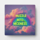 design features the text "Nuzzle into Niceness" in a playful, handwritten font, surrounded by colourful, whimsical cloud shapes and stars. The overall design conveys a sense of warmth, comfort, and positivity, inviting the wearer to embrace kindness and find joy in simple pleasures.