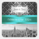 Customisable Invitations and accessories with an iconic view of the New York City skyline from the top of 30 Rockefeller Centre, featuring a black & white photo of the Empire State Building, lower Manhattan including the World Trade Centre. It also features a black damask pattern against a gradient silver grey background, and a turquoise ribbon. It also features a white gradient label in a silver look frame.