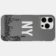 iPhone case featuring centred and reduced-size "NY" graphic, vibrant background, and black line art skyline with Statue of Liberty.