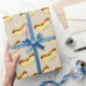 Gift wrap features an original illustration of a classic NYC hot dog with mustard on a bun.