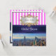 Customisable Invitations and accessories with an iconic view of the New York City skyline from the top of 30 Rockefeller Centre, featuring a photo of the Empire State Building, into lower Manhattan including the World Trade Centre. They also feature a pink and white pattern, a navy blue ribbon and a white gradient label in a gold look frame. (Note: Some coordinating accessories don't have the photo noted above.)