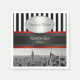 Customisable Invitations and accessories with an iconic view of the New York City skyline from the top of 30 Rock Centre, featuring a black & white photo of the Emp St Building, lower Manhattan including the World Trade Centre. They also feature a black and white striped pattern background and a red and black ribbon as well as a white gradient label with your choice of a silver or gold look pearl frame.
