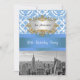 Customisable Invitations and accessories with an iconic view of the New York City skyline from the top of 30 Rockefeller Centre, featuring a black & white photo of the Empire State Building, lower Manhattan including the World Trade Centre. It also features a blue & white damask pattern, and a light blue ribbon as well as a white gradient label with your choice of a silver or gold look frame.