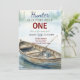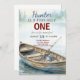 A vintage fishing baby shower invitation featuring a wooden rowboat with a fishing pole floating on a misty morning lake. Perfect for a peaceful outdoor celebration.