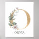 Letter O monogram floral. Letter O in golden brown texture accented with green watercolor compound leaves, flower blossoms and gold dust. Personalised with name in matching font.