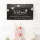 Oak Ridge Rustic Dark Brown Barn Wood, Sparkling Mason Jars, and Glowing String Lights Design with Twinkling strands of dangling lights and jars on a deep rich wood texture with white Lace accents. With Modern Typography Script Fonts. A rustic elegant country farmhouse style design - Personalised Wedding Welcome to Our wedding sign!