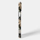 Customise this oak tree camouflage iPhone 15 plus case with your name in a trendy modern CAP font in grey on opaque cream. It's masculine and perfect for your favourite military, hunting, country or outdoorsman!