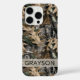Customize this oak tree camouflage iPhone 16 pro case with your name in a trendy modern CAP font in gray on opaque cream. It's masculine and perfect for your favorite military, hunting, country or outdoorsman!