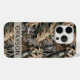 Customize this oak tree camouflage iPhone 15 pro case with your name in a trendy modern CAP font in gray on opaque cream. It's masculine and perfect for your favorite military, hunting, country or outdoorsman!