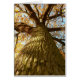 Card with photo of oak tree looking up at huge ridged trunk and branches and crown of yellow leaves with blue sky behind
