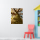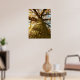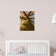 Poster / print with photo of oak tree looking up at huge ridged trunk and branches and crown of yellow leaves with blue sky behind