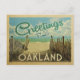 This Greetings From Oakland vintage postcard design features a sandy beach with a beautiful turquoise ocean water and above the sea, a blue sky with billowy white clouds. In vintage travels style.