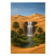 A captivating artwork depicting a cascading waterfall emerging between golden sand dunes, surrounded by lush palm trees and a vibrant green oasis. The painting reflects the contrast of nature between arid desert and flourishing greenery, creating a serene scene that transports the viewer to a world of tranquillity and calm, where sand and water meet in stunning visual harmony.