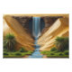 A captivating artwork depicting a cascading waterfall emerging between golden sand dunes, surrounded by lush palm trees and a vibrant green oasis. The painting reflects the contrast of nature between arid desert and flourishing greenery, creating a serene scene that transports the viewer to a world of tranquillity and calm, where sand and water meet in stunning visual harmony.