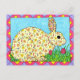This gentle bunny is covered with multicolored markings in many different shapes reminscent of those found on painted Oaxacan animal carvings. She is nibbling on some clover beneath a cloudless blue springtime sky. The entire scene is surrounded by a detailed Mexican-style border.
