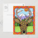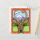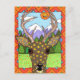 This beautiful deer with highly-detailed antlers stands in the foreground, showing off her intricate, colourful markings, similar to those found on Oaxacan animal carvings. A flower-filled field, pine trees, and mountains create an intriguing background. The entire scene is surrounded by a Mexican style border that matches the colours in the picture.