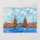 a traditional watercolor landscape artwork featuring the popular Oberbaum Bridge or Oberbaumbrücke in Berlin, Germany with a train crossing the bridge across the river spree.