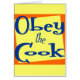 Obey the Cook snappy kitchen slogan. You must obey the cook if you want to eat! For chefs with an attitude! A funky 50's font in blue on a yellow and orange background.