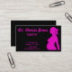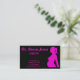 This pretty business card shows a pregnant lady on the right side in a hot pink colour. The background is black and all the text is hot pink. All text is customisable for your business!