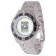 Has heft and feel of expensive stainless steel quartz watches. Good band with safety catch. I removed links, which is easy because engraved arrows show direction to push the linking pins. As always by this seller, the image (a railroad logo) is a perfect reproduction of my emailed image, and is precisely spaced and aligned.
