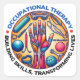 Building skills, transforming lives Square Sticker for Occupational Therapists. It features a range of symbols synonymous with occupational therapy, including hands engaged in therapeutic activities and common tools like resistance bands. The design emphasizes the intricacies and significance of hand therapy, highlighted by an anatomically detailed hand illustration. Choose the size of the sticker from the options menu.