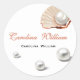 "Ocean 'A Little Pearl' under the sea baby shower classic round sticker, featuring soft cream tones and delicate pearl accents. This elegant sticker adds a refined and charming touch to your party favours, invitations, or decorations, perfectly complementing your underwater-themed celebration."