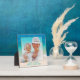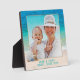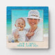 Create a standing photo plaque (5.25 inches square) with ocean background and a place for your text. Upload your photo to fit a square frame template which is decorated with seashells in the lower corner. A thin, beige line surrounds the photo with tropical sea water and beach sand as the background to frame the photo. The photo is printed onto the plaque to create a long-lasting keepsake of a special vacation or event. Include text beneath the photo with name / names, location, date, or anything that will fit into one, or two, lines. Do not let your wording get near the edge of the plaque or it may be cut off.