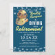 Ocean themed retirement party invitations featuring blue background that can be changed to any colour, a vintage scuba divers helmet, string lights, and a modern celebration template that is easy to personalise.