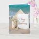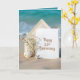 A blank card is elegantly set against a beach backdrop, accompanied by delicate white gypsophila flowers, a starfish, and a sand dollar for a 25th wedding anniversary.