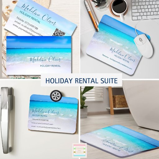 Iconic beach scene featuring mainly blue and aqua colours is the background of this Holiday Rental business name badge.