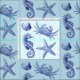 This is an ocean beach pattern featuring art in deep navy blue of a seahorse, starfish, sea shell and a crab. You can customise the sea green background colour.