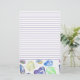 A fun lined stationery decorated with a border pattern of hand painted seashells in different shades of watercolor with pastel blue, green, purple and yellow with a spatter background. Great gift for a friend who collects seashells!