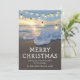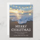Beach destination christmas cards featuring a coastal shoreline, a beautiful sunset, string lights, the saying 'merry christmas', a cute holiday message, and your names.