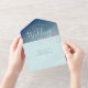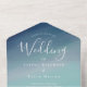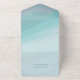 An all-in-one wedding invitation with a soft ocean-inspired background and white and blue lettering. This invitation includes a tear-away RSVP card. Simply add your information, add this invite to your cart, and enjoy your beautiful wedding.