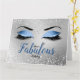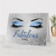 Blue Fabulous Glitter Eyes Large Birthday Card features a pair of large eye lids with pale blue glitter eyeshadow, diamanté effect liner with long black lashes on a silver glitter effect background. The word 'fabulous' is written in script in a matching pale blue with a small silver queen's crown hanging from the top of the loop on the 'L'. 'Have A' and 'Birthday' in written in black smaller script above and below the word fabulous. The inside of the card is white and on the inside back there is a small silver queen crown. On the outside back the background is the same silver glitter effect as the front and a small pair of the same blue glitter eyes and black lashes are at the bottom center. Designed by Jacqueline.