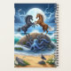 Artworks of Horses rearing on a boulder at the ocean, with dramatic waves. Owls, an Octopus and the moon are in the scene.