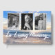 Memorial service guest book printed with a photo of the sun rising over the ocean. In loving memory written in a beautiful white calligraphy script. The funeral guest book features a three photo collage where you can add your own photos of your loved one. Personalise by writing their name and years living.