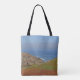Add a hint of the coast to your grocery and shopping trips with this tote bag featuring a landscape photo that captures the rolling hills and sand dunes with the rolling waves and blue horizon in the distance. The close dunes are covered with green coastal plants. The ocean displays beautiful shades of blue.