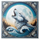 A striking tile design features a majestic wolf howling towards a full moon, framed by swirling ocean waves.