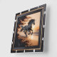 Experience the breathtaking beauty of nature captured in a stunning piece of art featuring a majestic black Morgan horse galloping freely along a golden beach at sunset. This exquisite image is framed by a ½-inch flat black wooden border, enhancing its elegance while providing a striking contrast to the vibrant colours of the sunset. The embedded wood showcases deep carvings with a charred, textured grain, adorned with rugged burn marks in shades of red, grey, and black, which beautifully complement the lighter wood tones. This artwork not only serves as a visual delight but also as a functional piece, as it can be transformed into a personalised clock. With The Design Tool, you can customise the colour of the numbers and choose from various font styles, allowing you to create a unique piece that reflects your personal aesthetic. The meticulous craftsmanship simulates the appearance of carved wood, offering a rustic charm that enhances any space without the need for real materials.