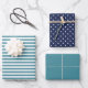 If you have some gifts and want to wrap them harmoniously, these wrapping paper are perfect for you. The combination of colours (navy blue, white, dark cyan) and patterns create a lovely and fresh look. You can see stripes patterns in dark cyan on white background, white polka dot pattern with a navy blue background, and plain wrapping paper in dark cyan colour. You can also use this wrapping paper for your creative projects. I hope you like it.