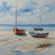 "Ocean Retreat". Restful waves caress the shore of this peaceful seascape, where boats rest quietly upon the tranquil sands, under a still blue sky. A colourful stylised watercolour in gentle blues and sand colours.