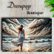 This extraordinary composition merges the fluidity of Art Nouveau with dramatic coastal surrealism. The focal point – a solitary figure in a windswept dress that seems to echo the very movement of the waves and clouds – creates a mesmerising visual symphony. The palette is masterfully curated, featuring luminous pearl whites and oceanic teals that transition into warm golden undertones where sun meets sea. Most remarkable is the harmonious flow between elements: the dress's fabric, rolling clouds, and cresting waves share an identical rhythmic quality that suggests divine orchestration.