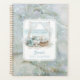 This beautiful beach themed planner features watercolor design. The graphic of a beach cabana bed with the ocean surrounded by a blue glittery background. Colours used include, slate blue, forest green, ivory and tan.