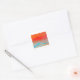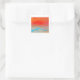An abstract design of an ocean sunset with bold colours in red, orange, cyan, blue, and beige.