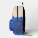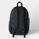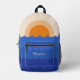 Beautiful elegant backpack with minimalistic scene of ocean and setting sun. Personalise it with a name or text. This simple illustration captures the serene beauty of a sun setting at the ocean. The waves are simple curved lines, starting from the bottom of the illustration and extending upwards towards the horizon line. Different shades of rich blue add to the sea dynamics. The sun is a large circle glowing in a brilliant orange, dipping into ocean. The sun and the ocean waves evoke vintage vibes and create tranquil scene and elegant design.