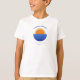 Beautiful elegant t-shirt with minimalistic scene of ocean and setting sun. Personalise it with a name or text. This simple illustration captures the serene beauty of a sun setting at the ocean. The waves are simple curved lines, starting from the bottom of the illustration and extending upwards towards the horizon line. Different shades of rich blue add to the sea dynamics. The sun is a large circle glowing in a brilliant orange, dipping into ocean. The sun and the ocean waves evoke vintage vibes and create tranquil scene and elegant design.