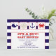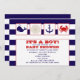 An ocean themed baby shower invitation featuring illustrations at top of a whale, a sand dollar, an anchor, and a crab. Background on front and back is blue stripes. Personalise the text with details of your occasion.